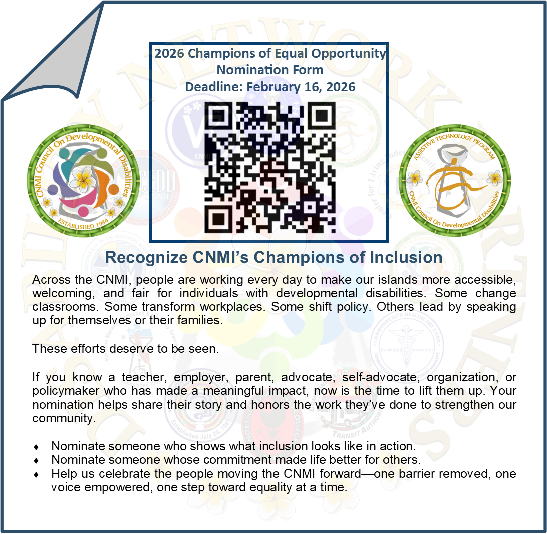 The DD Council’s mission is to promote systems change to ensure that individuals with developmental disabilities and their families have the same opportunities as others in the community. We shall continue to work hard to amplify the voice of individuals with disabilities and their families, because, the decisions we make here in the CNMI have a significant impacton their lives. The Council accomplishes this mission by helping to ensure that individuals with developmental disabilities and their family members play a vital role in the design of and access to quality delivery of services, supports and other assistance and opportunities.